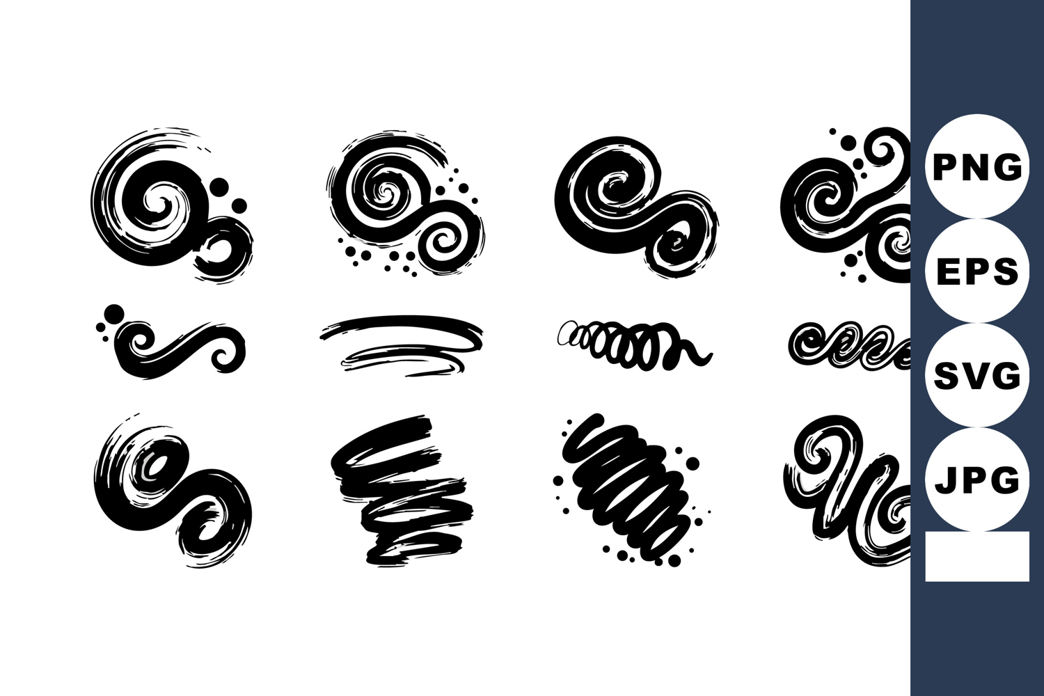 This vector set features abstract black swirl brush strokes with spiral and twirl shapes, ideal for artistic and creative design use. The style is dynamic and expressive.