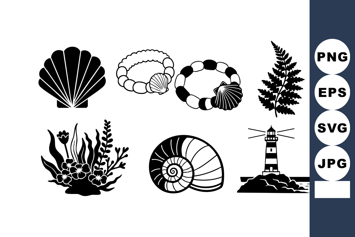 This vector file presents black and white marine-themed icons including shells, seaweed, coral, and a lighthouse, ideal for coastal or nautical design projects, calm and classic.