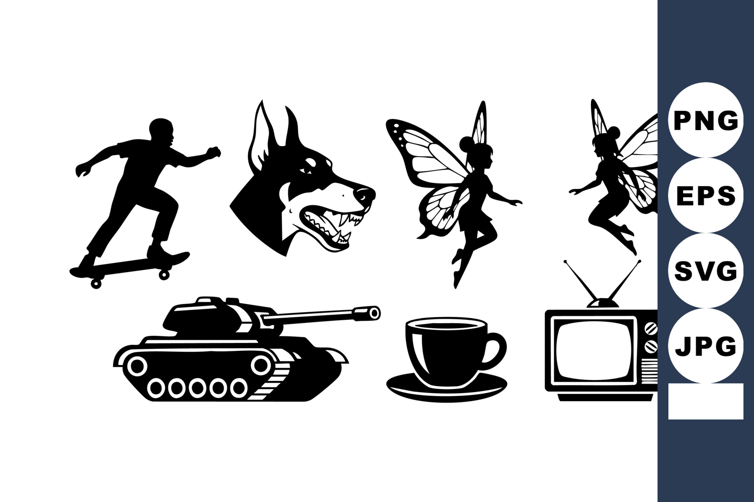 Black silhouettes of a skateboarder, dog head, butterfly fairy, tank, coffee cup, and vintage television appear in a clean vector style, evoking nostalgic and playful vibes.