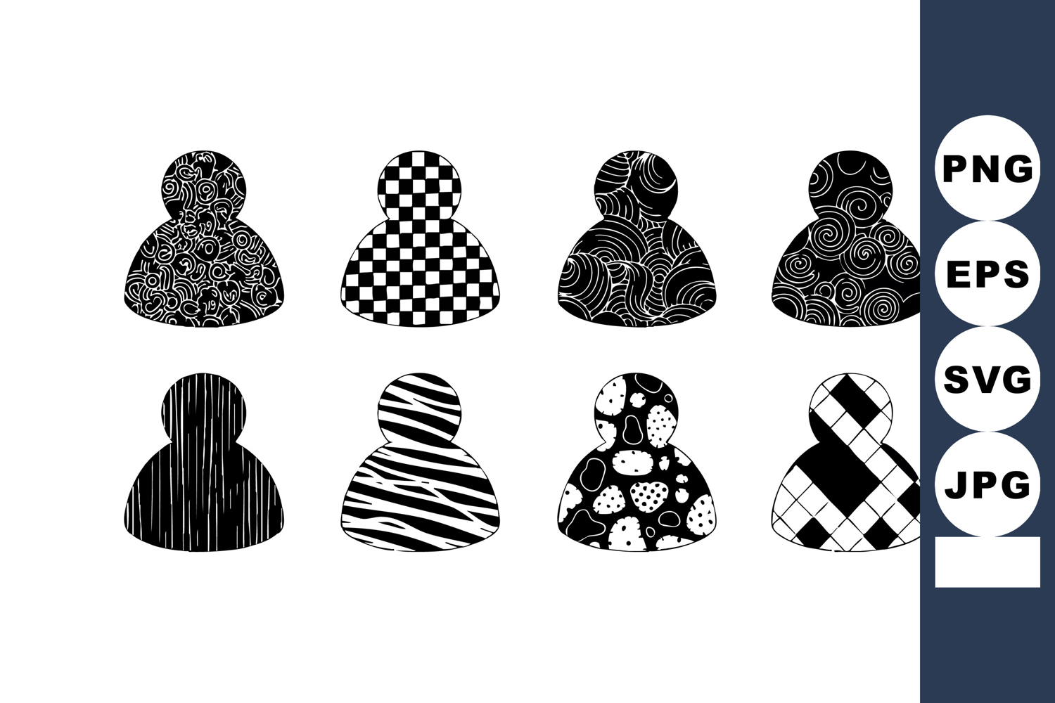 Vector file shows eight abstract human silhouettes featuring diverse black and white pattern designs. This collection highlights creativity and contrast with a modern artistic mood.