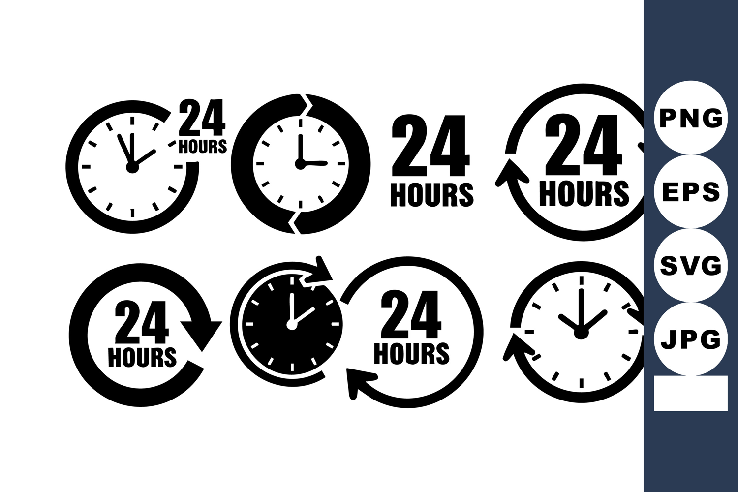 Set of black and white 24 hours clock icons with circular arrows and time symbols representing continuous service and availability in a simple vector style. Clean and modern mood.