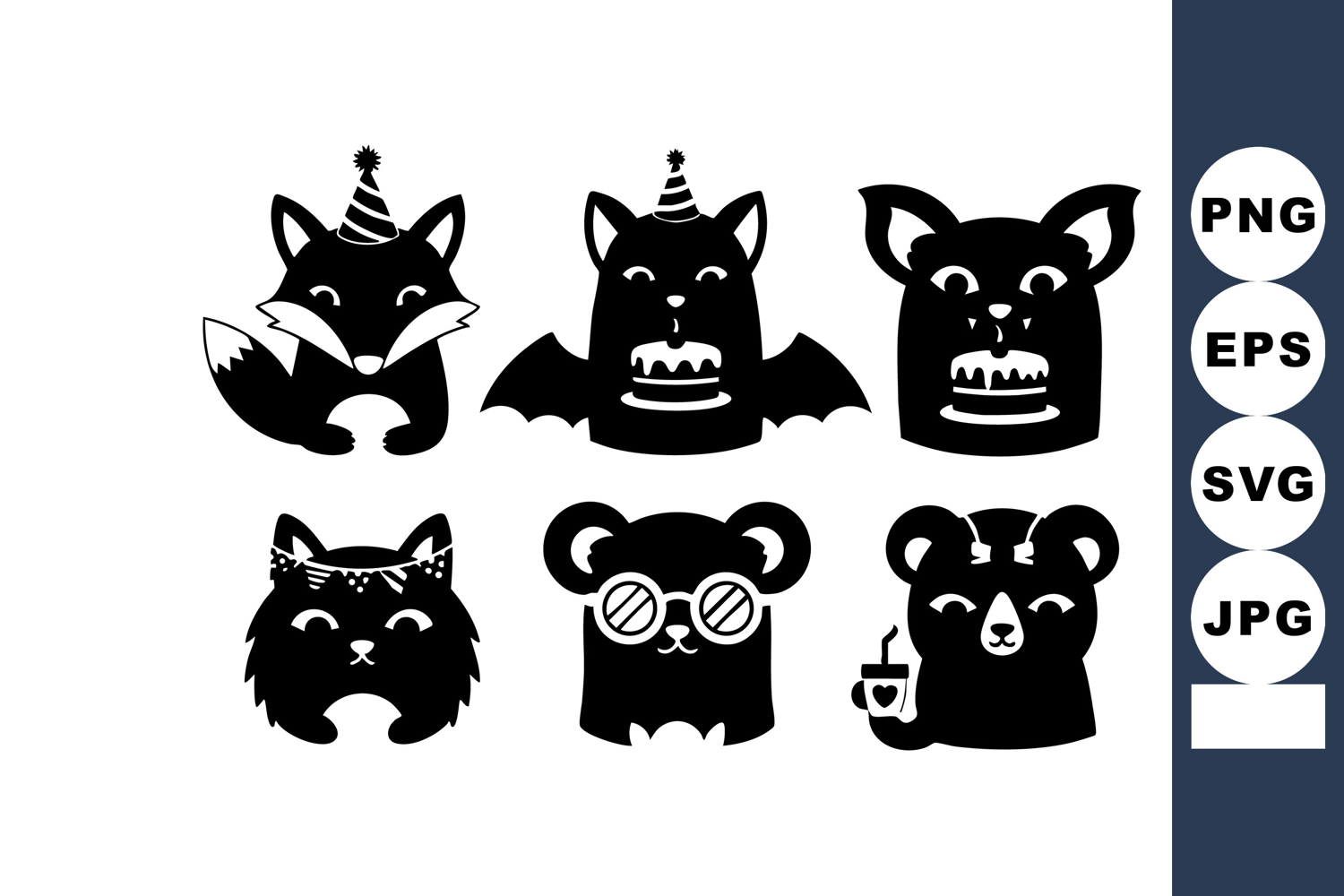 This vector features six black silhouette animal faces wearing party hats and accessories, including a fox, bat, bear, cat, mouse, and another bear. The style is playful and festive. Cheerful mood.