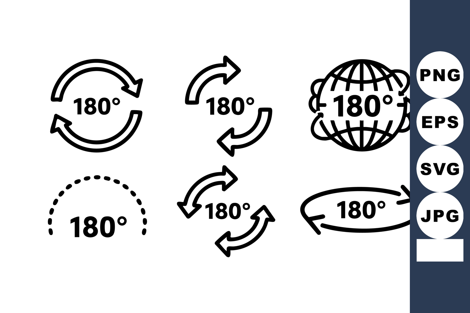This vector file features six 180 degree rotation arrow icons in multiple styles including solid, dotted, curved, and globe with rotation symbol, perfect for design projects and presentations. Clean and versatile vector.