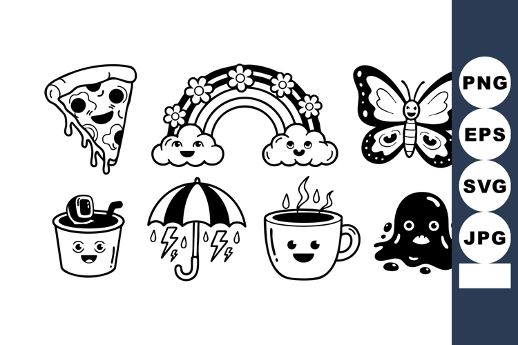 This vector features adorable black and white cartoon icons including pizza, rainbow, butterfly, coffee, umbrella, jellyfish with cheerful faces. The playful style creates a joyful and whimsical mood.