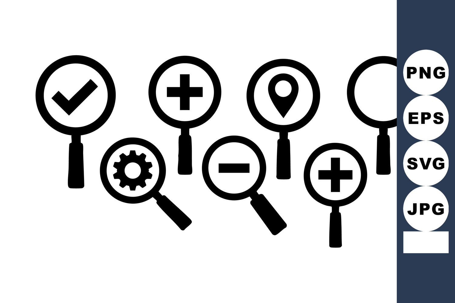 Vector set of magnifying glass icons featuring check marks, gear, plus, minus, and location symbols, suitable for UI design and search functions. Simple, clear, black and white style. Clean.