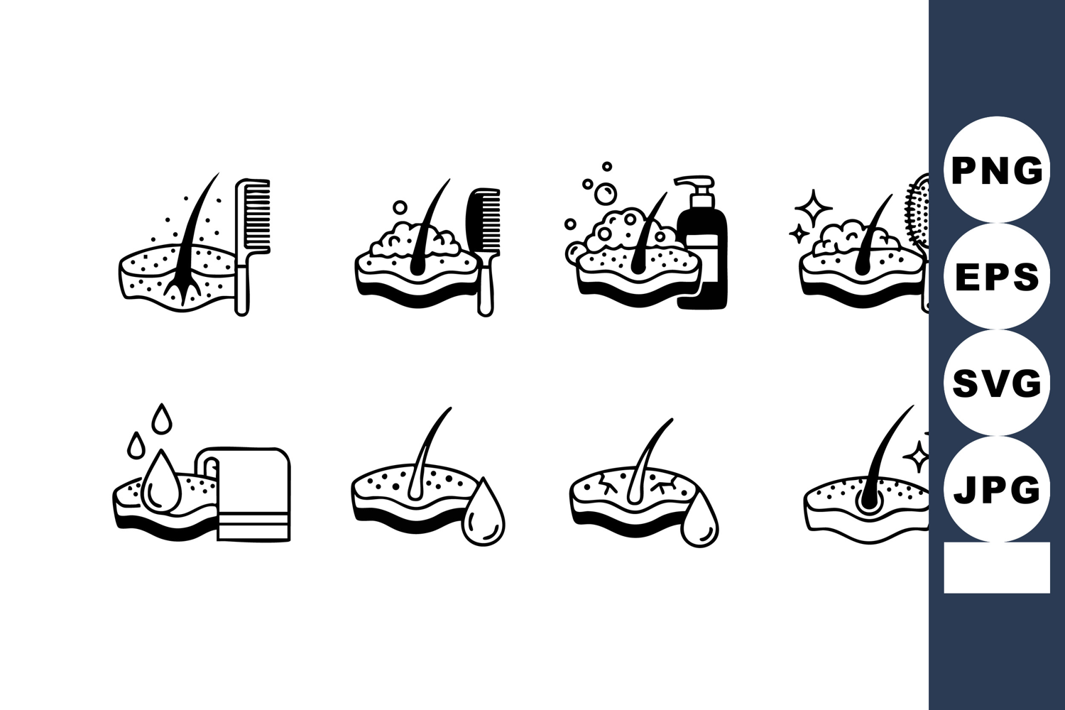 Vector icons showing hair care steps including shampoo, soap, brush, and scalp cleansing, emphasizing hygiene and hair health in a clear black and white style, clean design, practical and informative, professional mood.