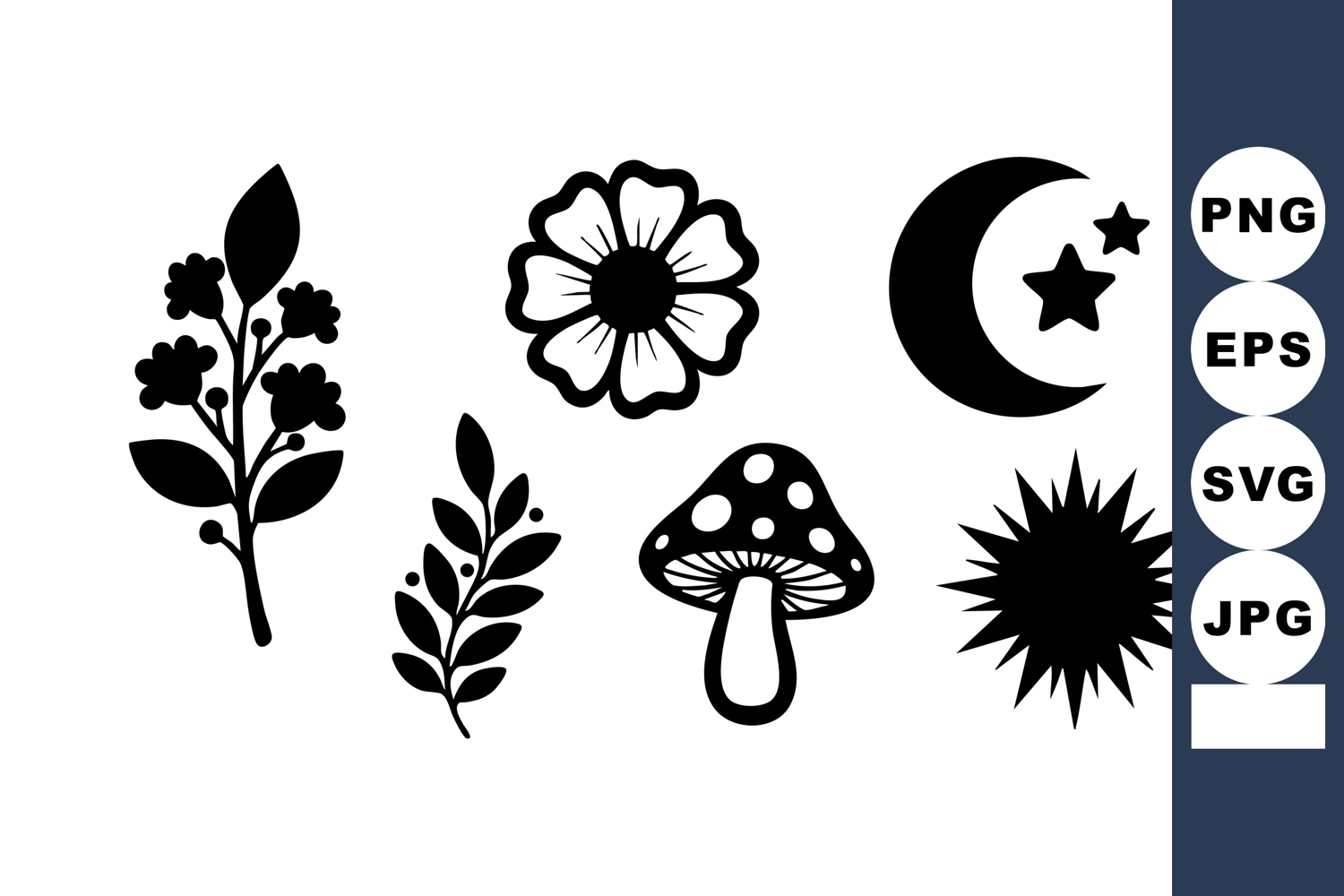 Black silhouette floral moon stars mushroom sun nature vecto example image 1