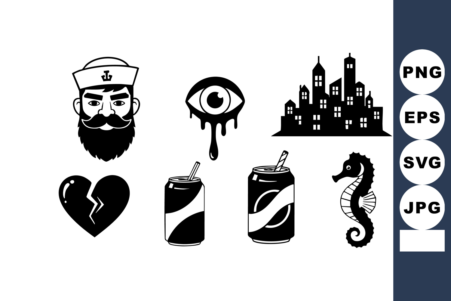 This vector file contains black silhouette icons including a sailor man with beard, a dripping eye, a city skyline, a broken heart, two soda cans, and a seahorse, all in simple style, minimalistic and striking.