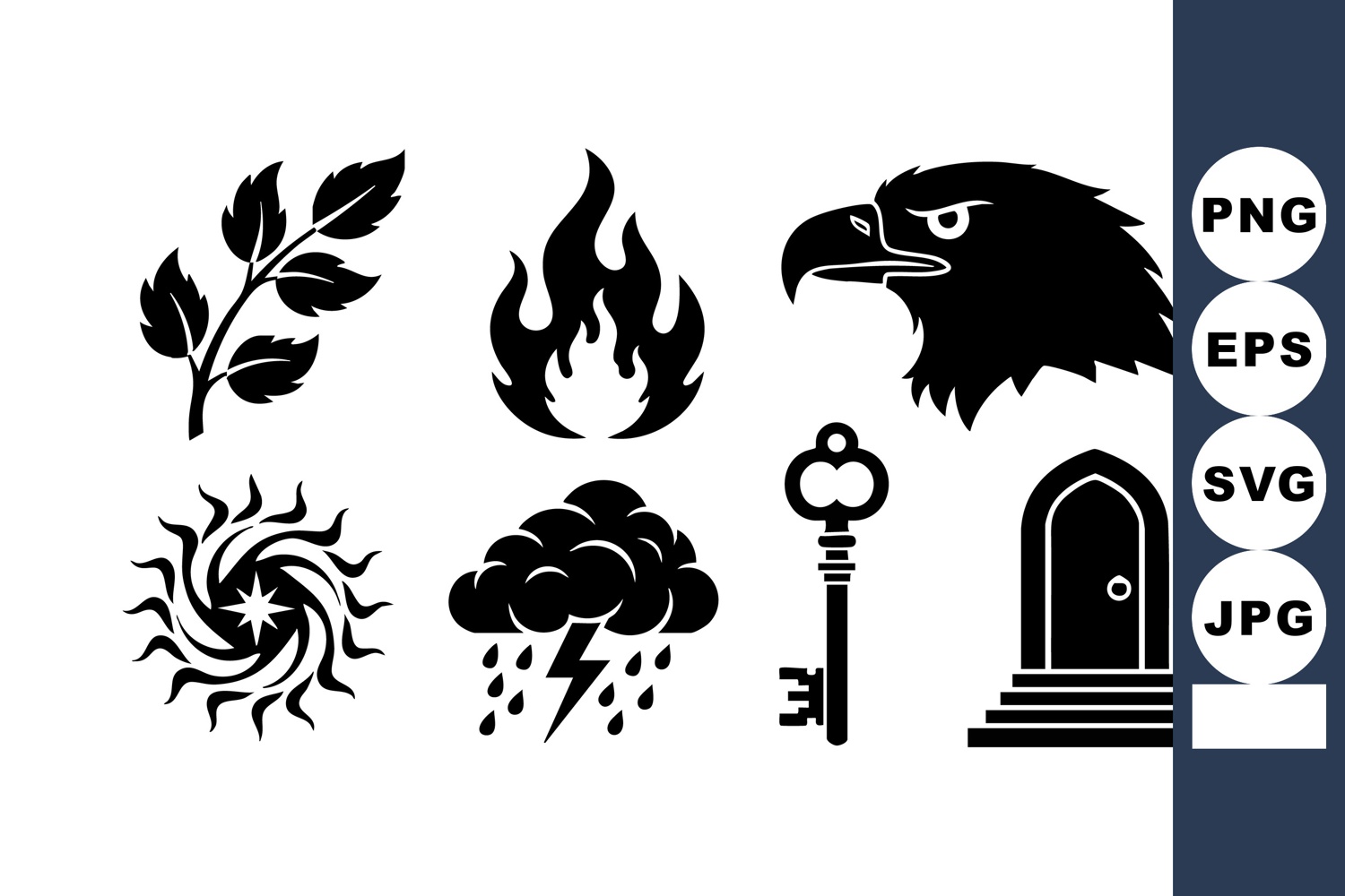 Vector icons showcase natural elements like leaf, fire, sun, cloud with lightning, and symbolic objects such as eagle, key, and door in black silhouette style, simple and bold. Calm mood.