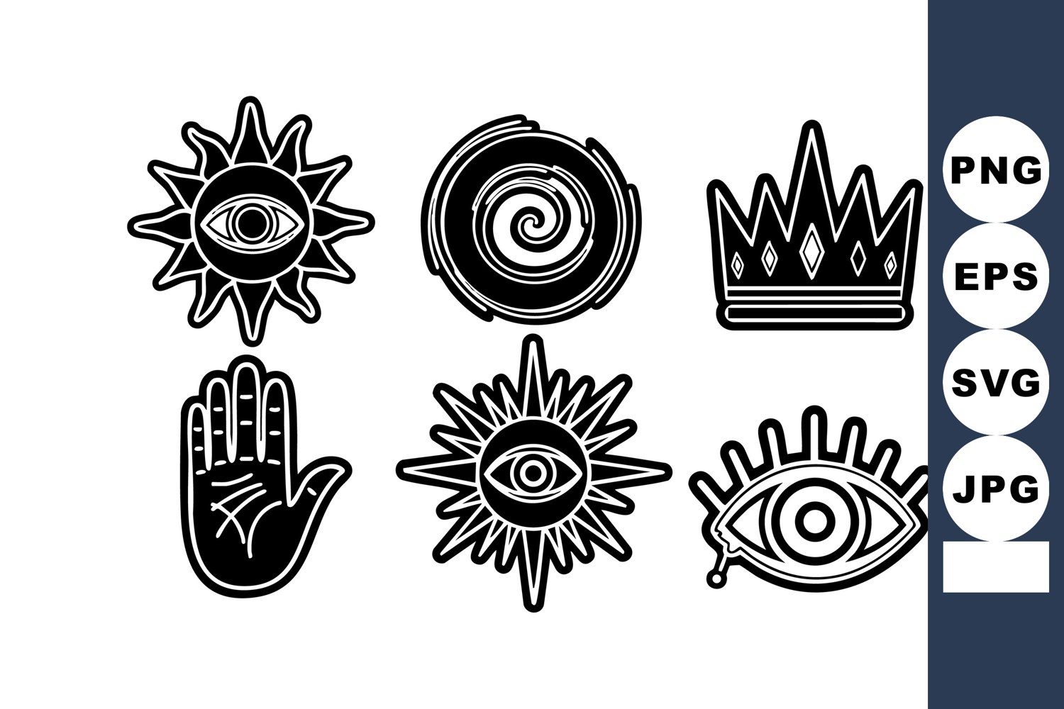 This vector features mystical symbols including an eye, hand, crown, sun, and spiral in bold black and white lines, conveying an enigmatic and spiritual mood.