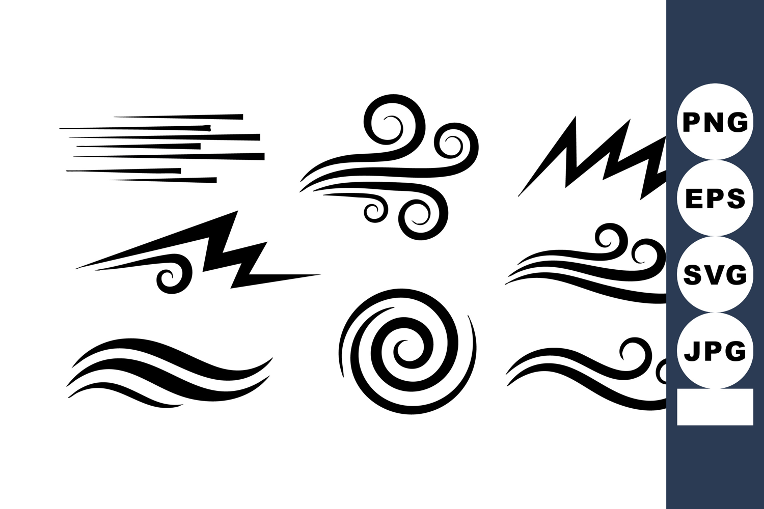 Vector collection of black wind and air flow icons representing natural elements and weather in a minimalistic style, conveying movement and energy with a clean, modern feel.