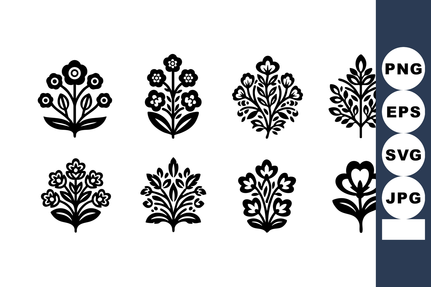 This vector file features a collection of decorative flower icons in black silhouette style, showcasing diverse floral designs for use in creative projects and graphic decoration. Elegant.