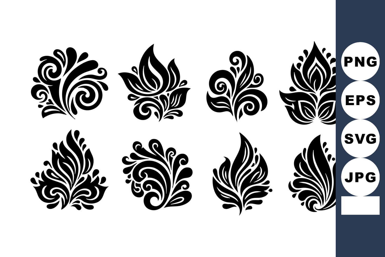 This vector features black ornamental floral designs arranged in two rows, showcasing elegant shapes for decoration and pattern making in a stylish and artistic manner. Creative and classic.