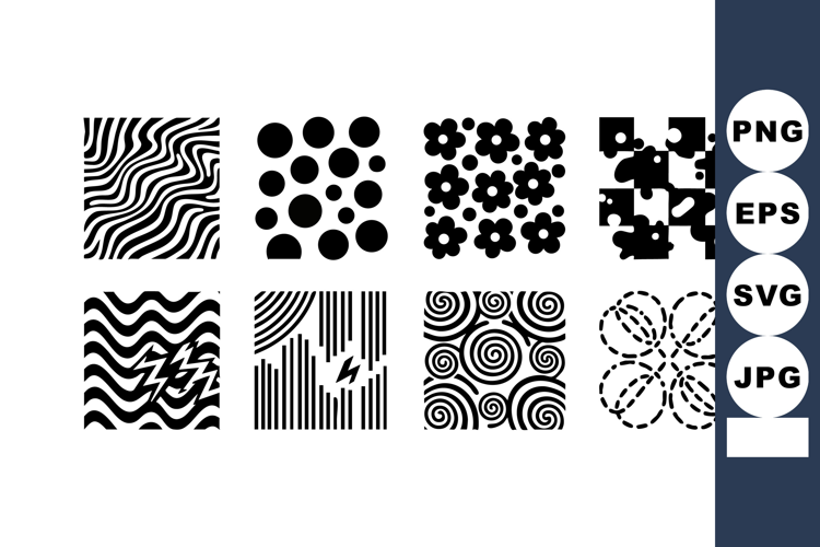 This vector set features eight distinct black and white geometric patterns including waves, dots, flowers, spirals, and abstract shapes in a clean, bold style. Versatile and modern design. artistic