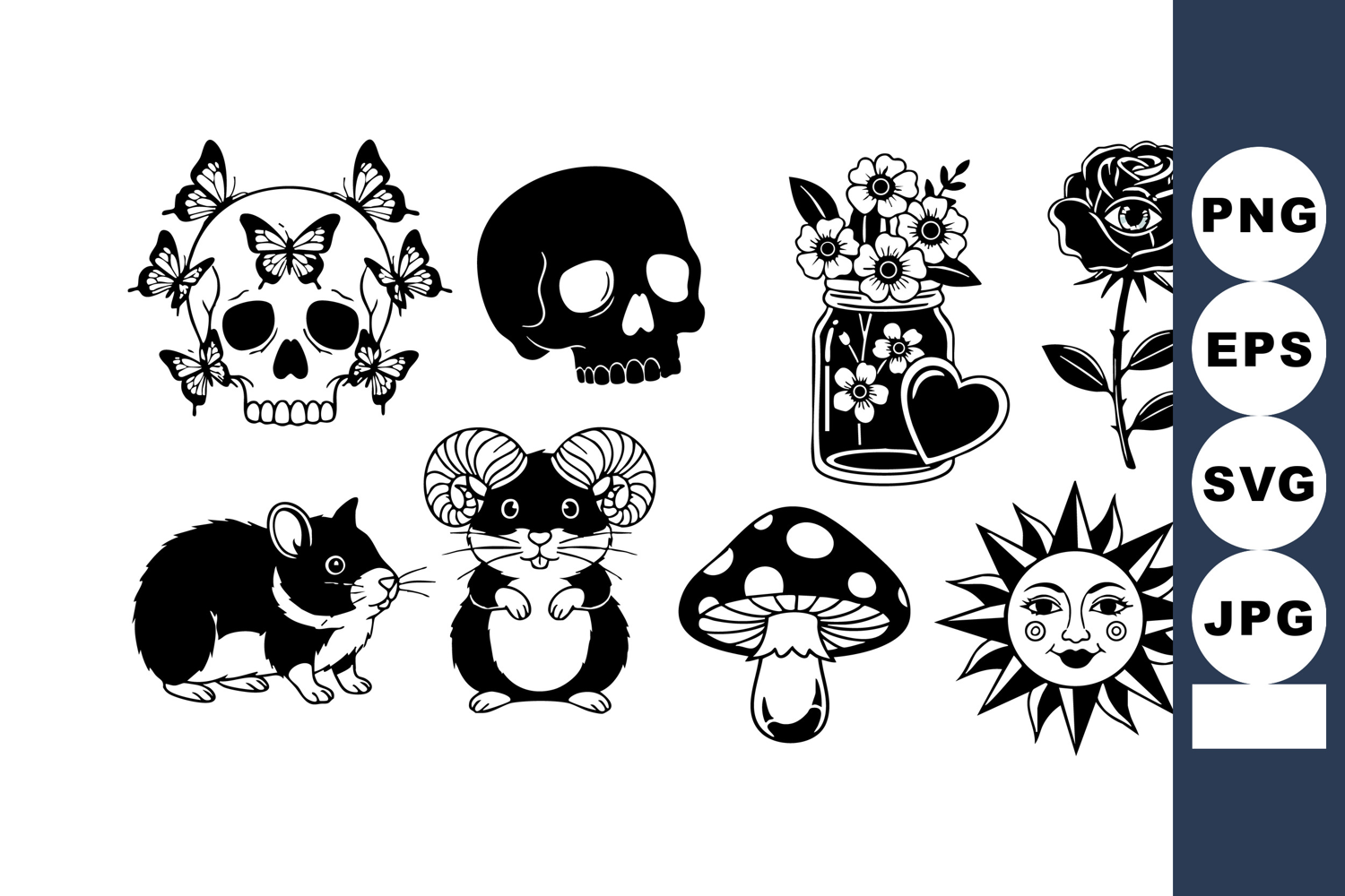 Similar Design Products to Collection of black silhouette skulls, animals, flowers, and