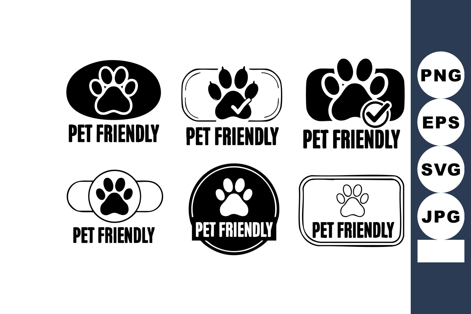 This vector set features six pet friendly icons with paw prints in black and white style, suitable for labels or signs promoting animal care and pet acceptance. Clean minimal design, friendly tone.