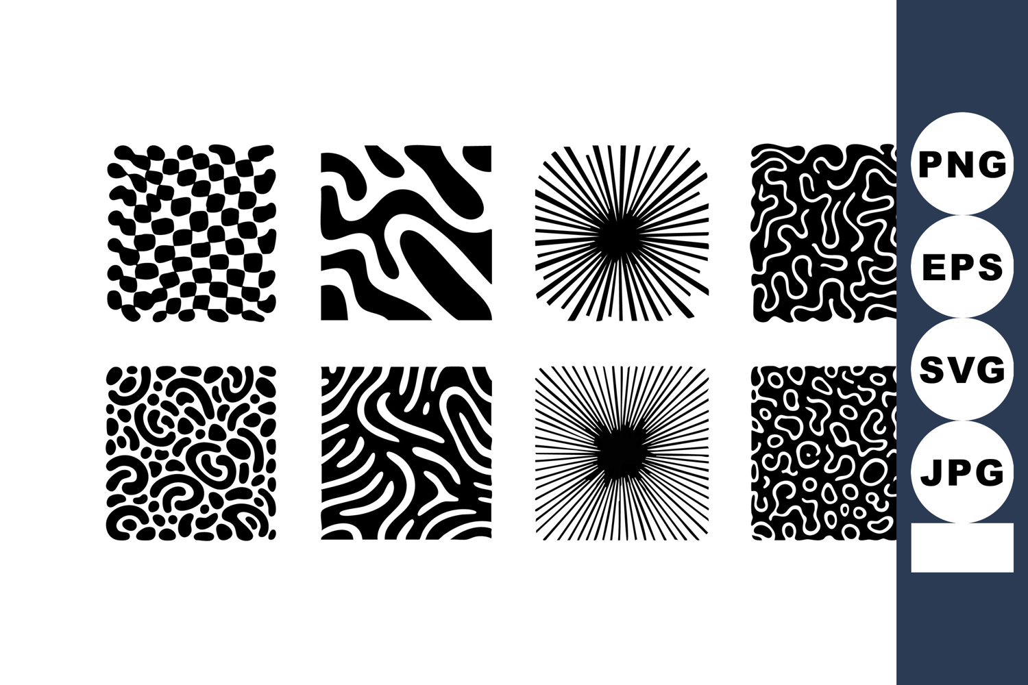 This vector set features abstract black and white seamless patterns with organic and geometric shapes, ideal for modern graphic design projects, creating a bold and dynamic visual effect. Contemporary.
