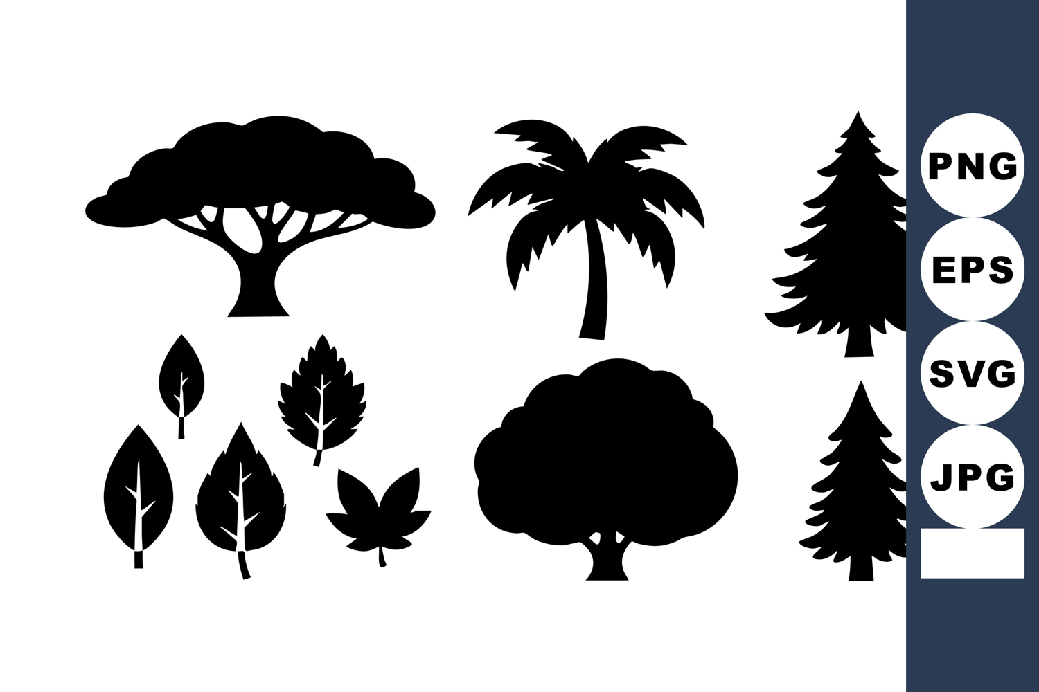 This vector file displays silhouette shapes of different trees and leaves including tropical palms and evergreen pines, ideal for nature-themed design projects, presenting a clean and bold style. Calm and natural.