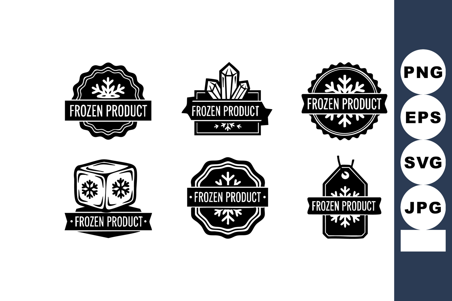 Frozen product label icons set with snowflake, ice cube, and example image 1