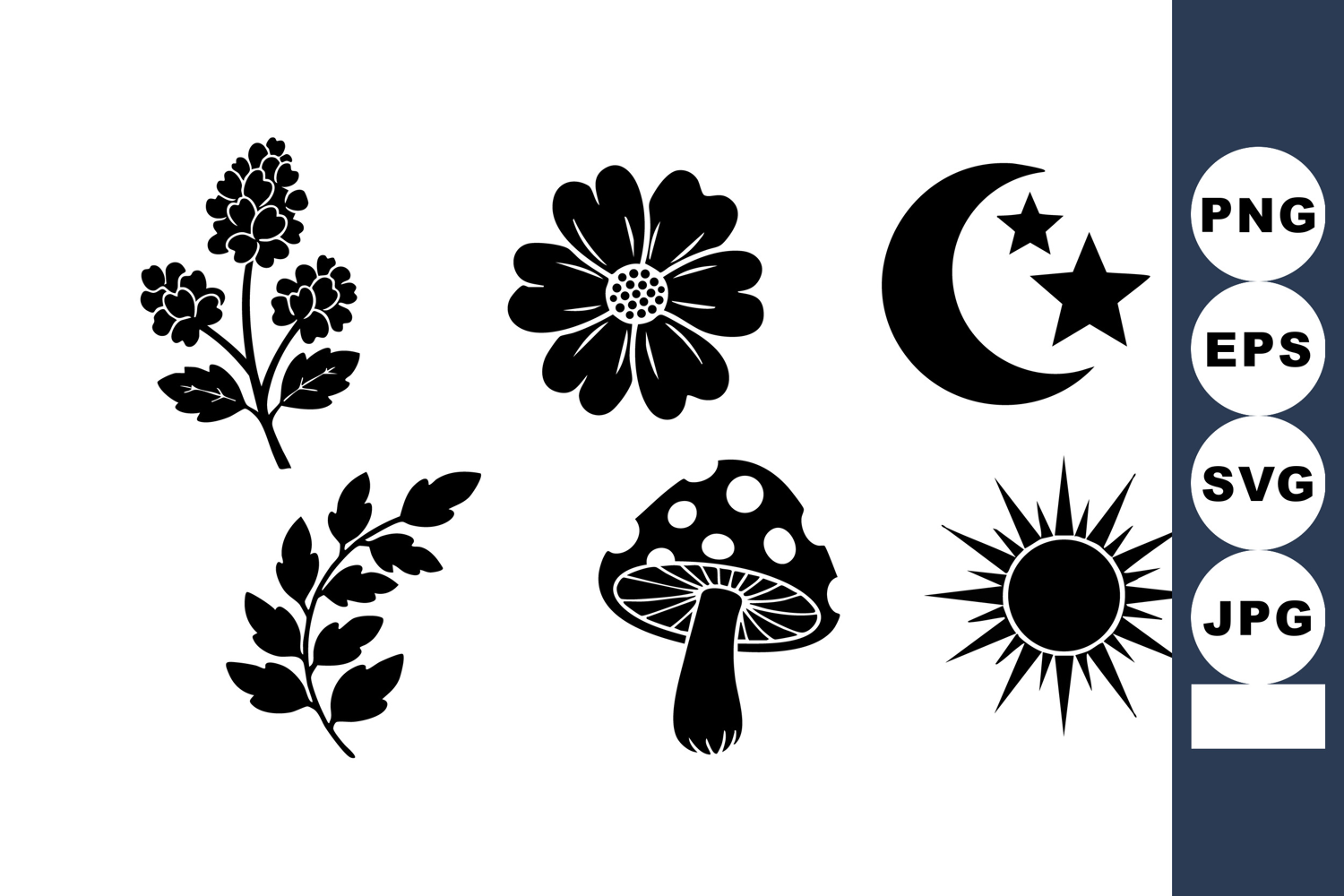 This vector features black silhouette icons of natural elements and celestial symbols, such as flowers, leaves, mushroom, crescent moon with stars, and sun, creating a simple and elegant design. Calm and balanced.