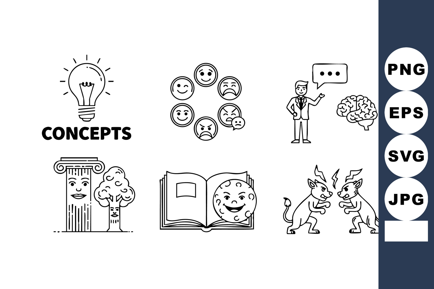 This vector set presents icons illustrating concepts including ideas, emotions, philosophy, communication, knowledge, and duality with devil figures. It features simple black line art, clean style, and clear symbolism. Thoughtful mood.