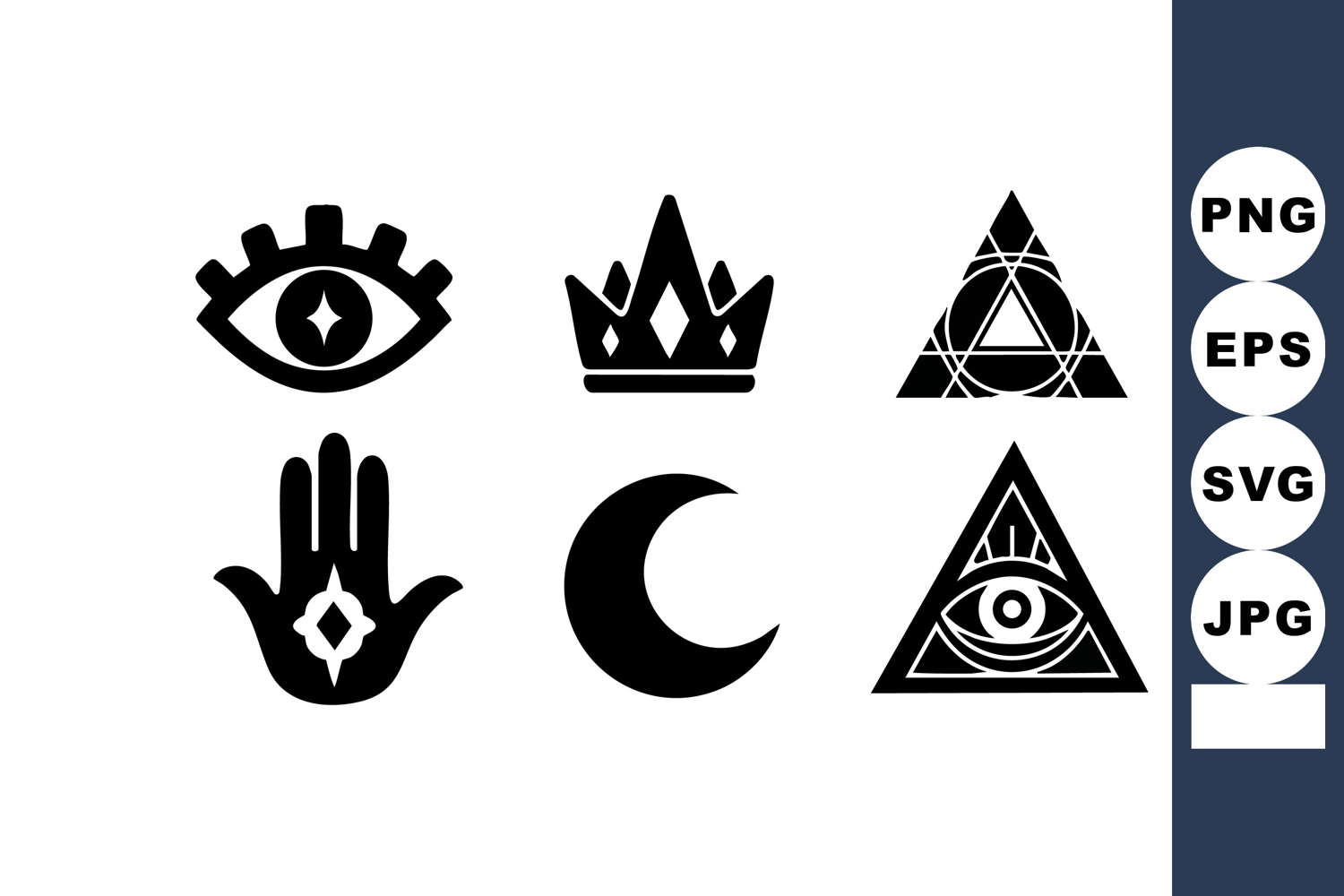 This vector file displays a collection of esoteric symbols such as an eye, crown, crescent moon, hand, and geometric shapes in black silhouette style. The design is mystical and enigmatic.