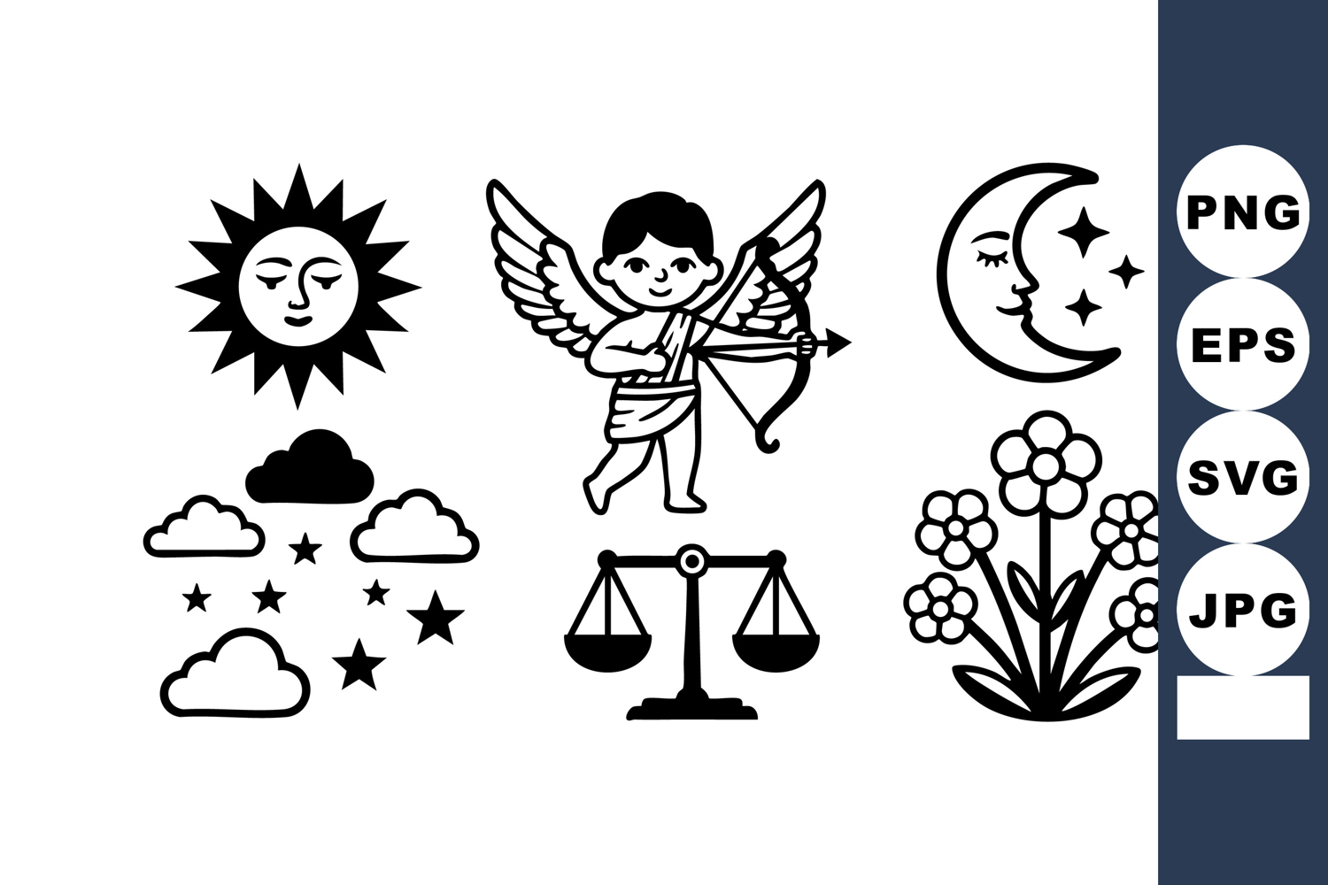 Vector set of celestial and natural symbols including sun, moon, stars, clouds, angel with bow, scales, and flower bouquet in black and white style, simple and clear. Calm mood.