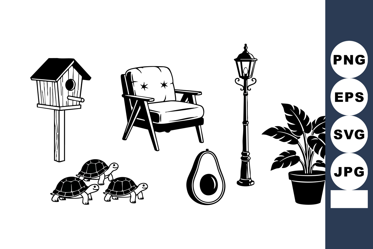 Vector set features black and white birdhouse, armchair, lamp post, avocado, potted plant, and turtles in simple style, perfect for lifestyle and nature-themed projects, clear and minimalistic mood.
