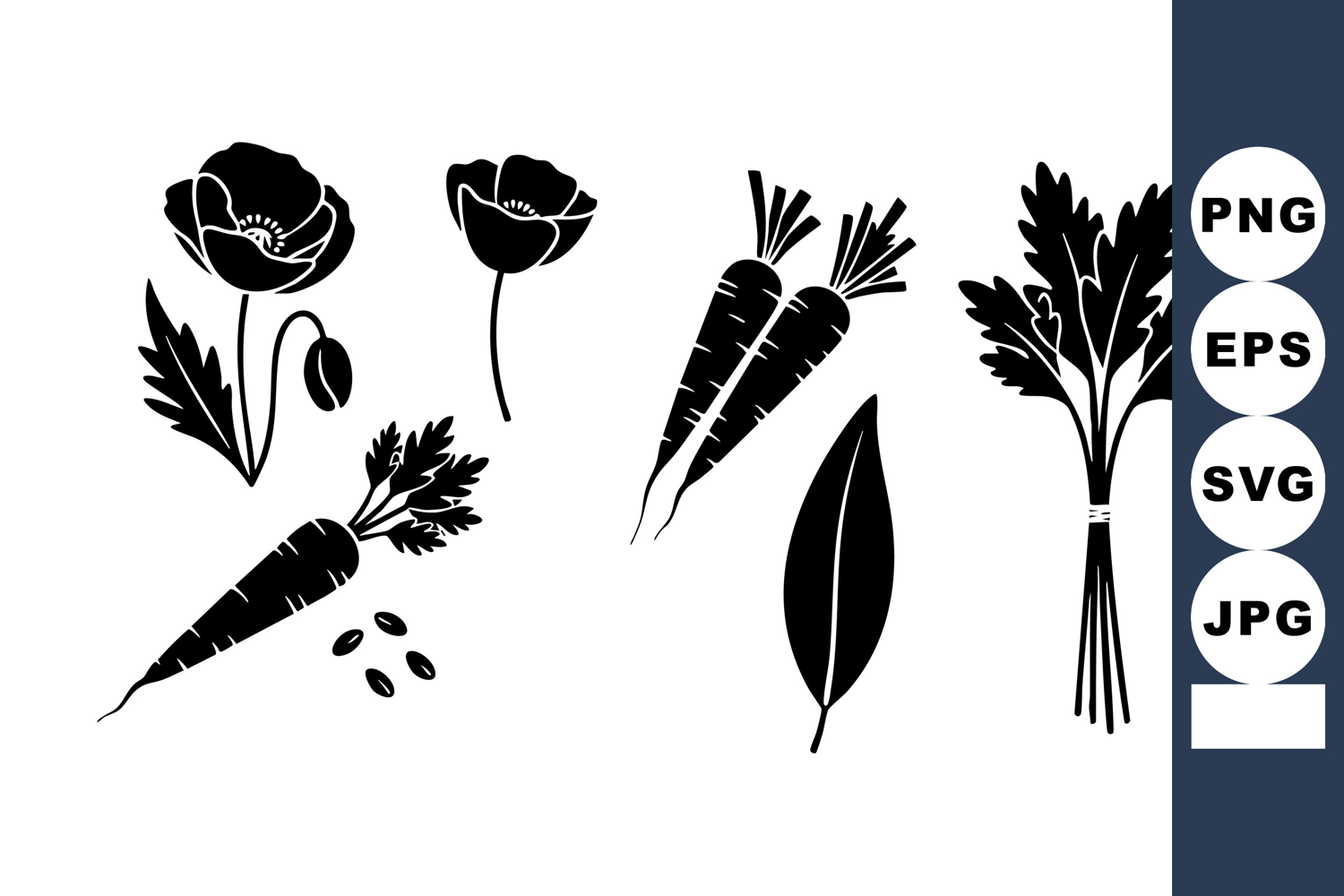Black silhouette vector of carrots, parsley, leaves, and flowers arranged simply for natural and organic design projects. Clean and minimal style with clear shapes, calm mood.