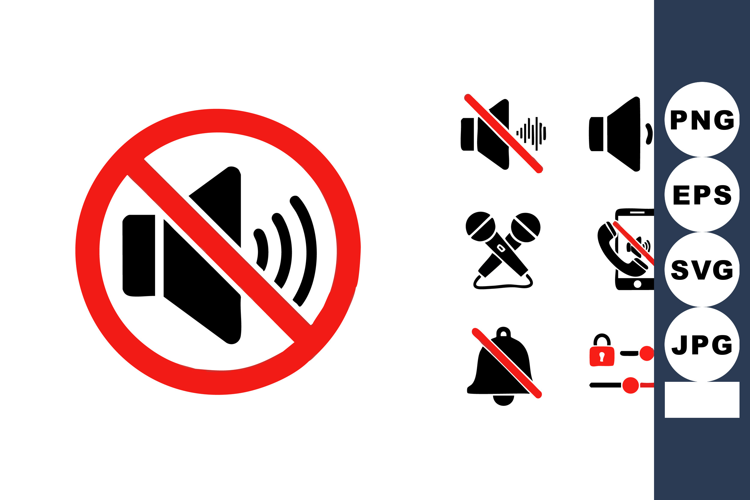 Set of vector icons showing no sound, mute microphone, phone silent, bell off, and volume controls in black and red colors for clear silent mode communication. Clean design, functional, and modern style.