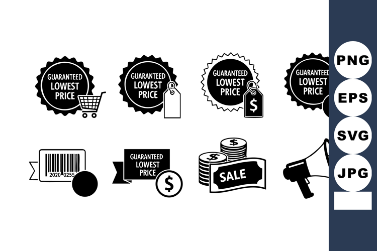 Vector set displays guaranteed lowest price badges with shopping cart, barcode, price tags, money, sale, and megaphone icons in black and white style, offering promotional marketing elements. Clean and bold design, professional.