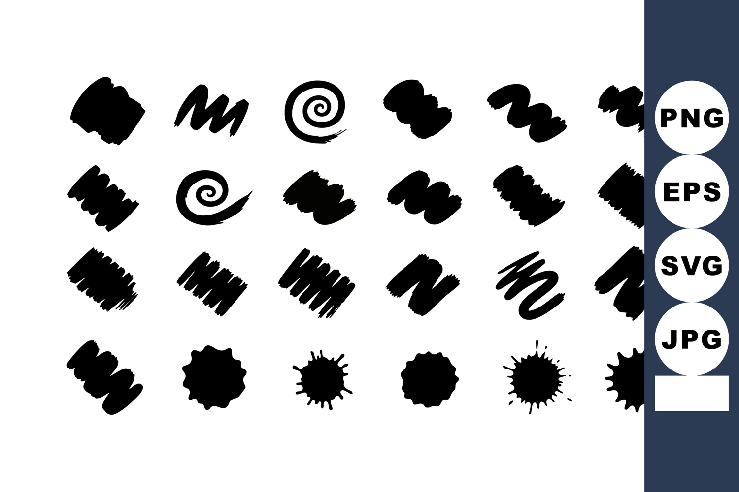 This vector set shows various black ink brush strokes and splatters in different shapes and styles, perfect for creative, artistic, or graphic design projects. Dynamic and bold mood.