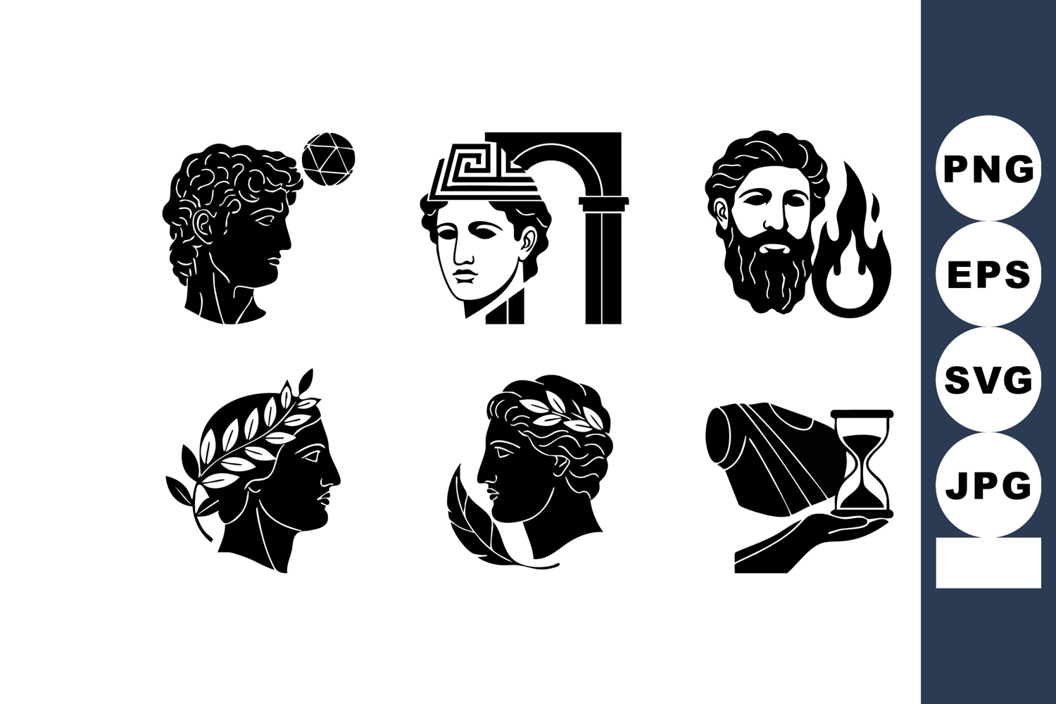 Vector set features stylized heads of ancient Greek gods and mythological symbols, including laurels, fire, and hourglass, in black silhouette style, perfect for historical or cultural design projects, classic mood.
