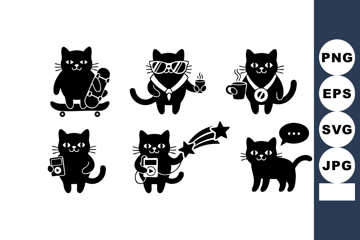 Silhouetted black cat characters show diverse activities including skateboarding, drinking coffee, wearing sunglasses, holding a magic wand, and chatting, in playful vector style, cheerful mood.