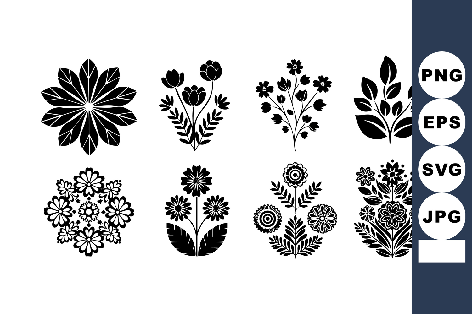 Black silhouette floral designs with various flower and leaf