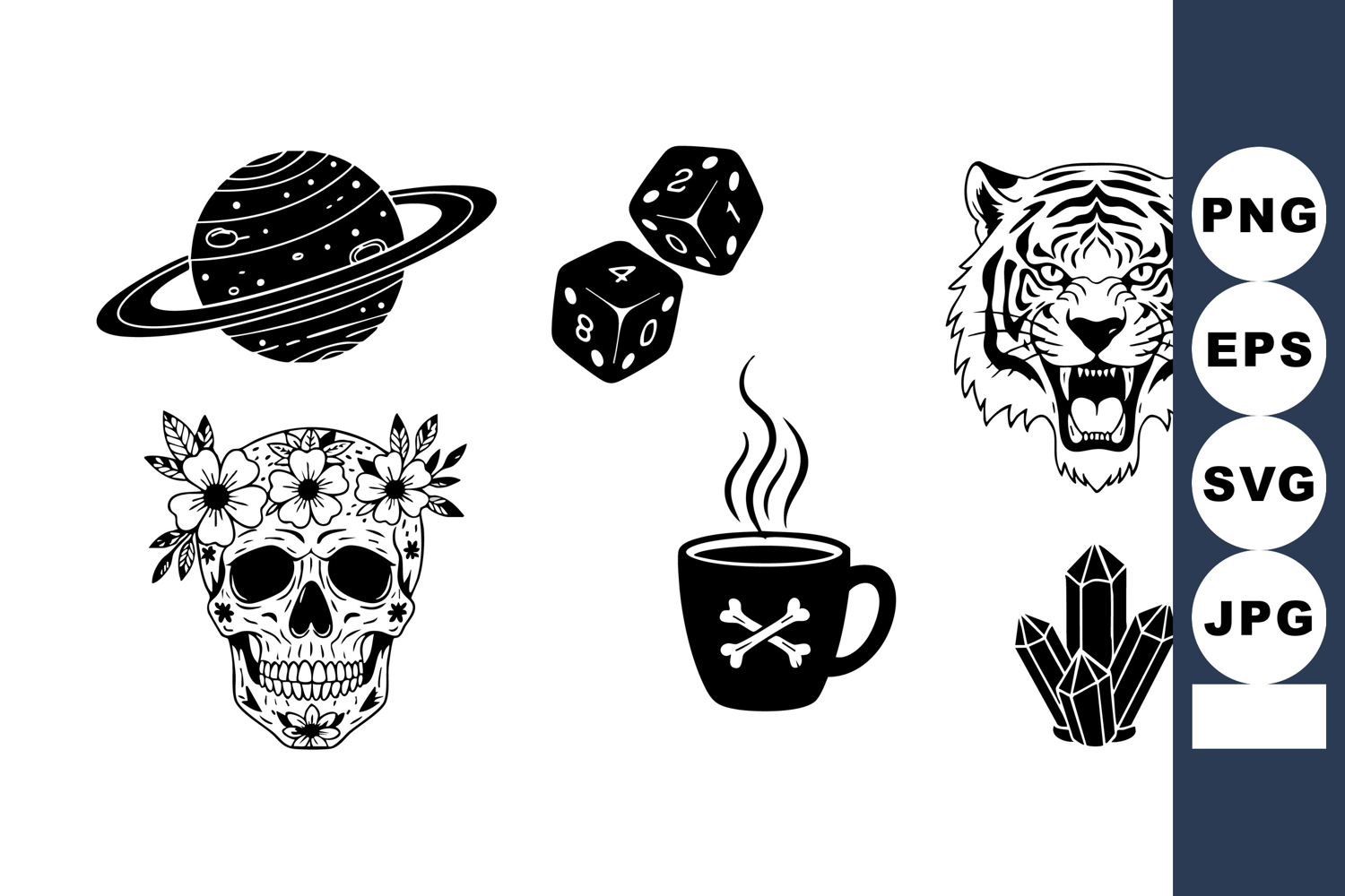 Black and white vector icons represent a skull with floral crown, roaring tiger head, steaming coffee mug, ringed planet, pair of dice, and cluster of crystals, all in minimalistic style. Creative and bold.