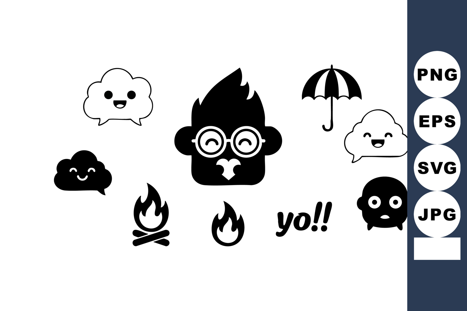 This vector features a playful monkey face with glasses surrounded by cheerful clouds, flames, and an umbrella, creating a lively and whimsical mood.