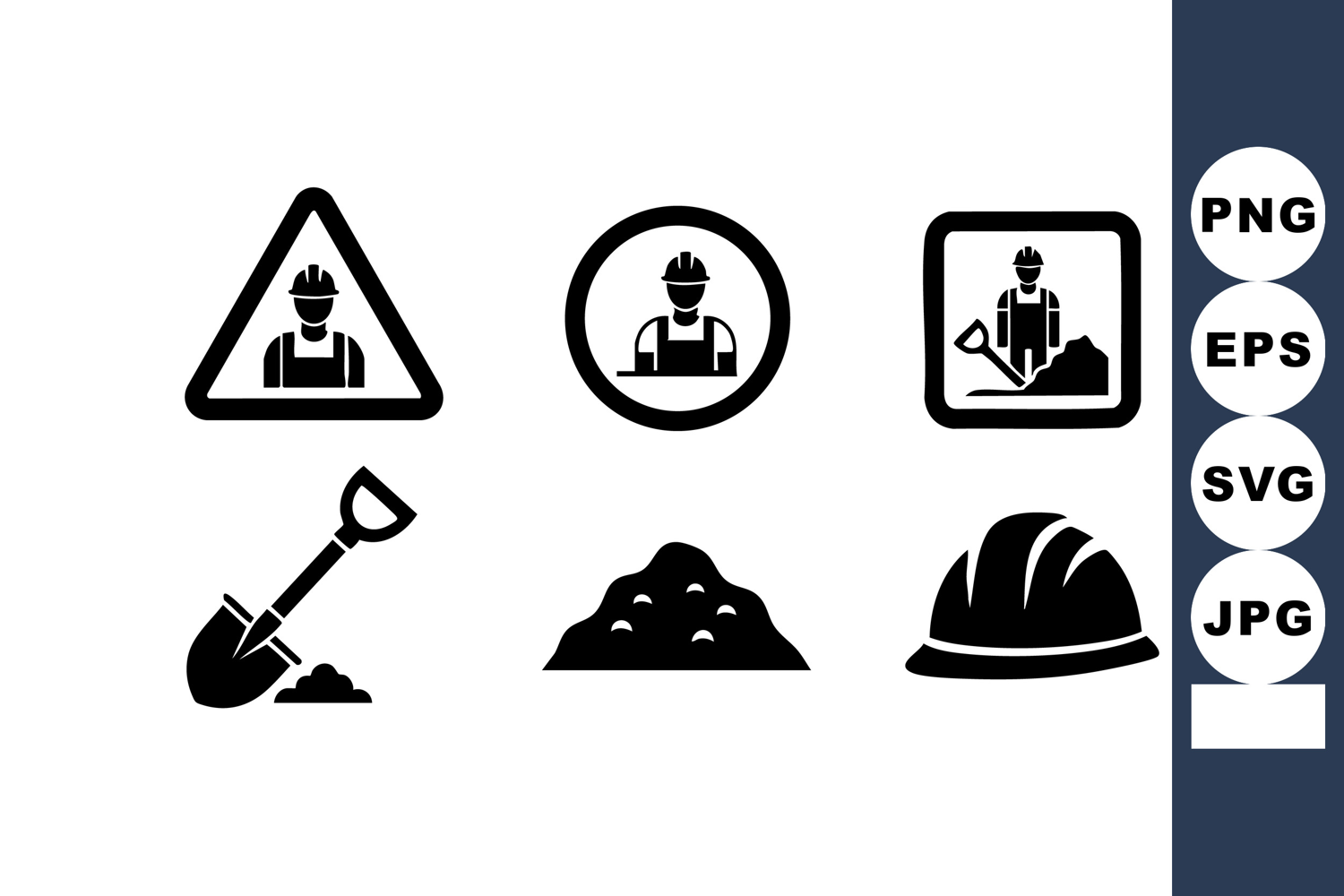 Set of six black construction-related icons featuring worker, helmet, shovel, and soil elements, designed for industry safety communication and awareness, simple and clear style, professional mood.