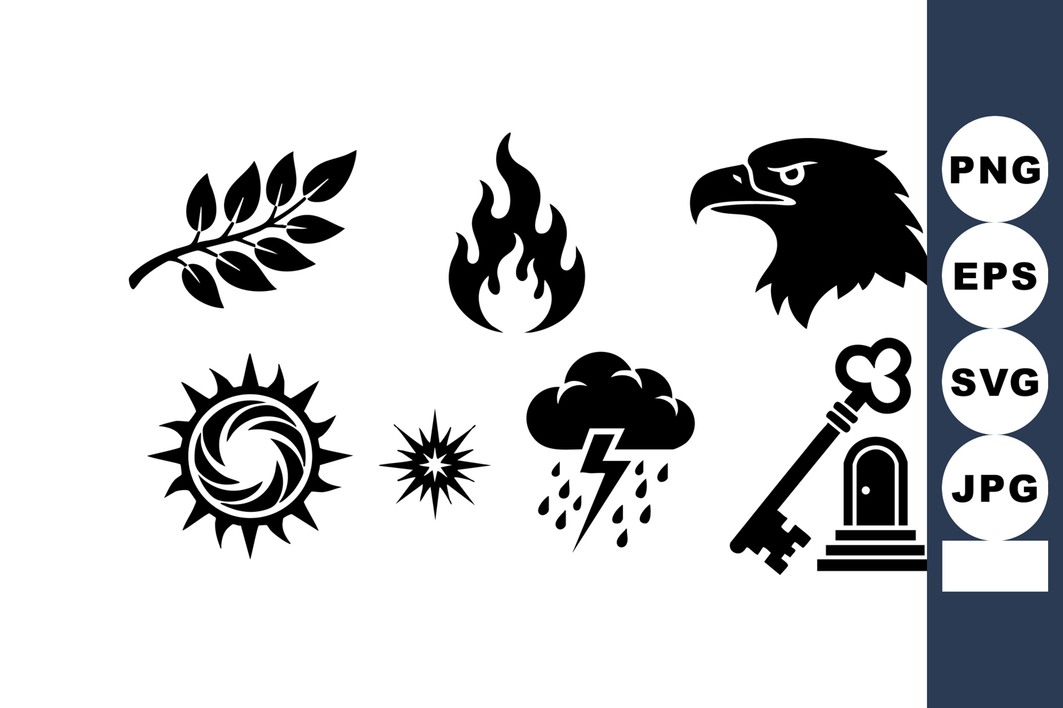 This vector file presents a collection of black silhouette icons featuring an eagle head, fire flame, key, sun, thunderstorm, leaf, and alarm bell in a simple flat design style, bold and clear.