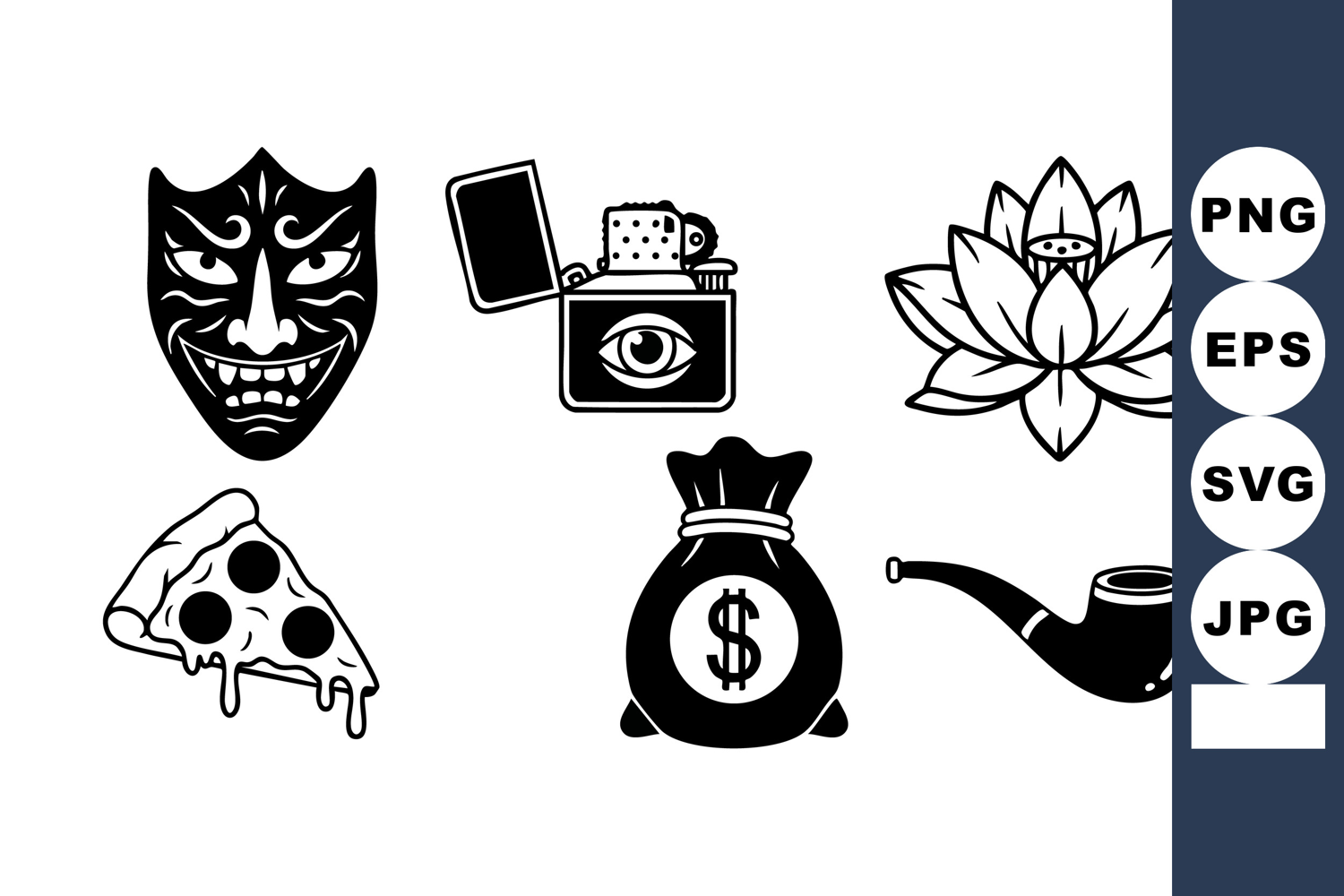 This vector collection features six iconic black and white symbols including a tribal mask, lighter with eye design, lotus flower, pizza slice, money bag, and classic smoking pipe. Simple and bold.