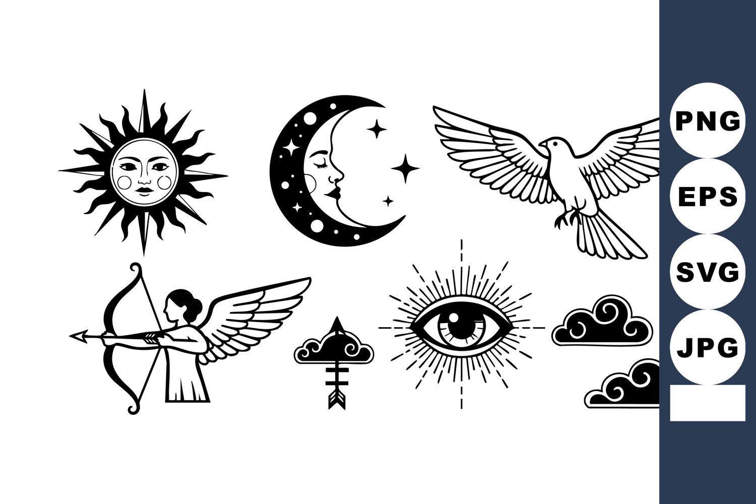 This vector features black and white mystical symbols including sun, moon, eye, dove, cupid with bow, and clouds, presented in a simple, stylized design. Mysterious and spiritual mood.