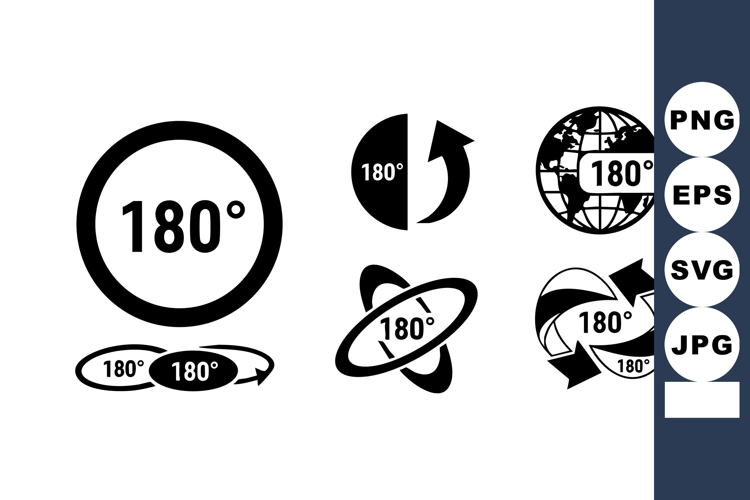 This vector file displays six 180 degree rotation icons featuring circular arrows and a globe element in black and white style, providing clear and simple directional symbols. Clean and minimalistic.