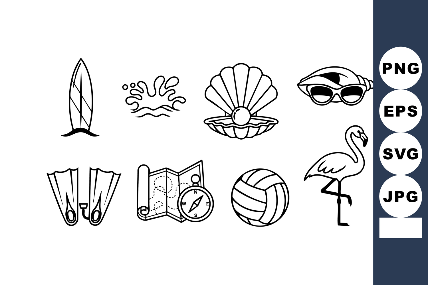 This vector image displays summer beach icons including surfboard, waves, seashell, sunglasses, snorkel fins, map, volleyball, and flamingo, evoking a fun and sunny mood.