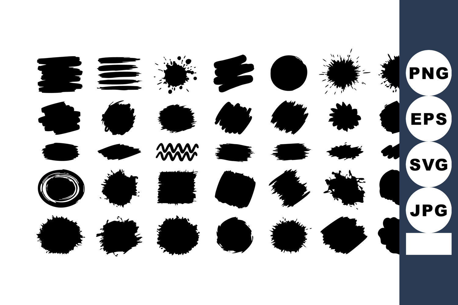 This vector set features diverse black paint splatters and brush strokes in multiple shapes and textures, ideal for artistic and design use. The style is bold and dynamic.