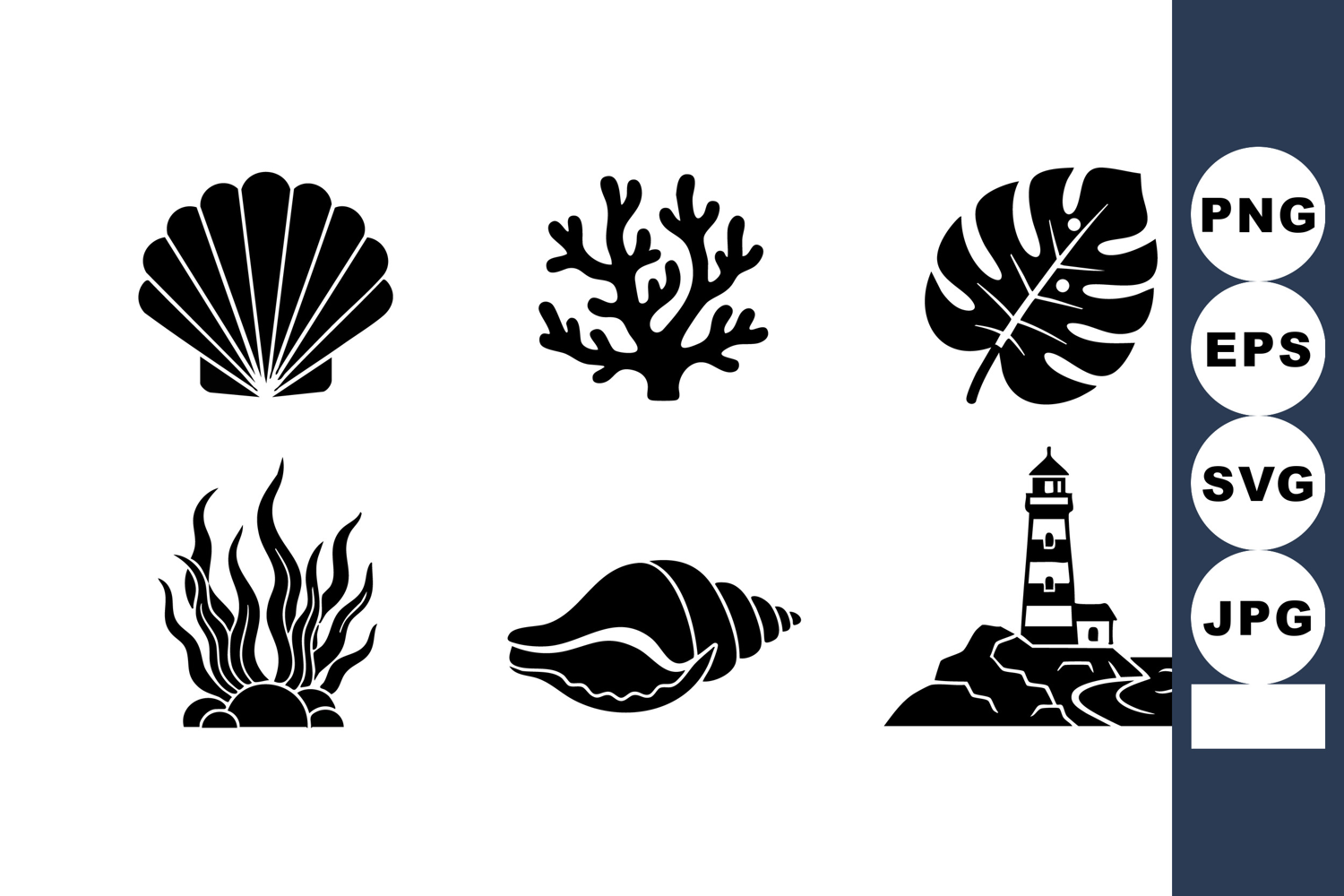 Silhouettes of seashell, coral, seaweed, and lighthouse represent marine life and coastal environment in black vector style, creating a nautical and natural mood.