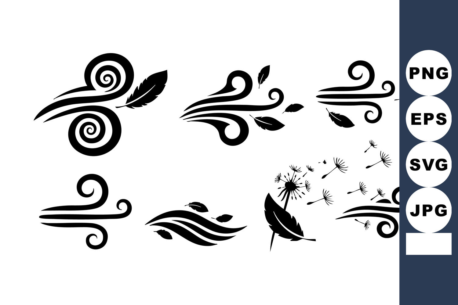 This vector file features black silhouette icons of wind gusts combined with leaf and dandelion seed designs, illustrating natural air movement in a simple, elegant style. Calm and airy mood.