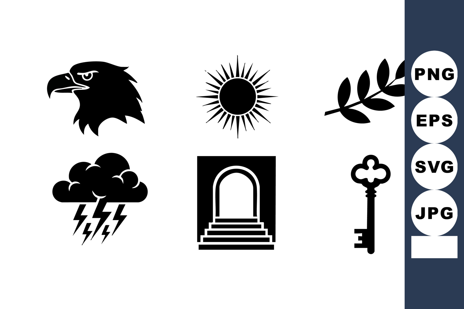 This vector file presents black silhouette icons of an eagle head, sun, branch, thunderstorm, arched door, and vintage key, all displayed with clear contrast and minimalistic style, evoking boldness.