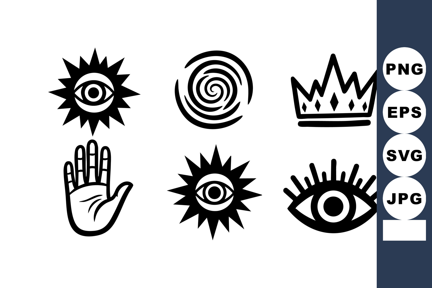 This vector collection features black mystic symbols including a hand, sun, eye, crown, and spiral shapes. The designs convey mystery and spirituality with bold lines. Enigmatic mood.