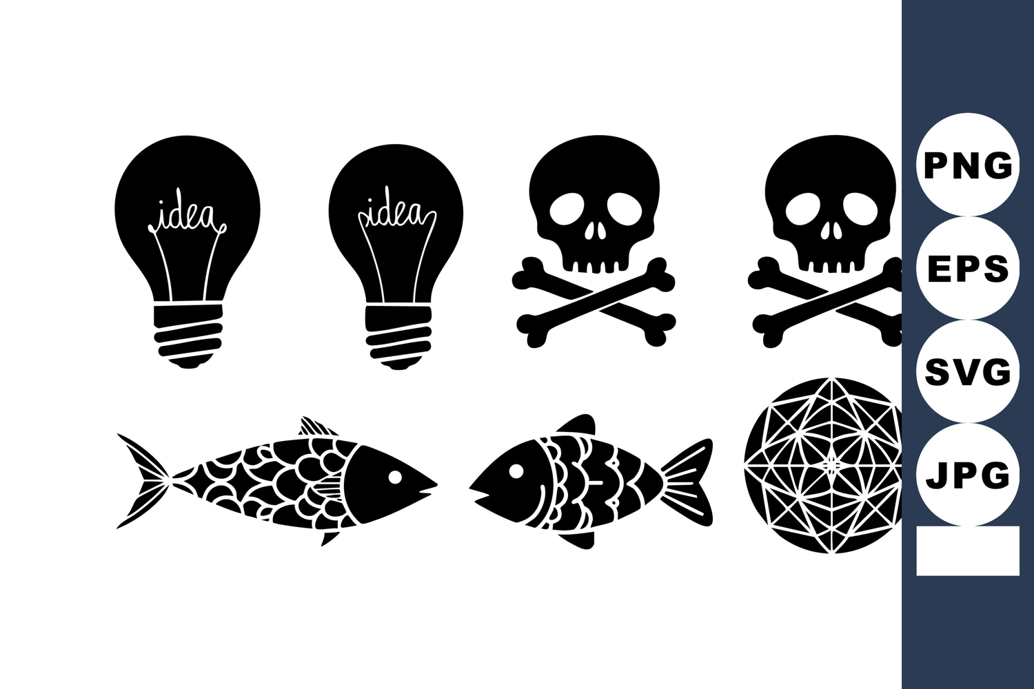 This vector file presents black silhouette icons including light bulbs with ideas, skull and crossbones, fish, and a geometric sphere, all in a clean minimalist style. Creative mood.