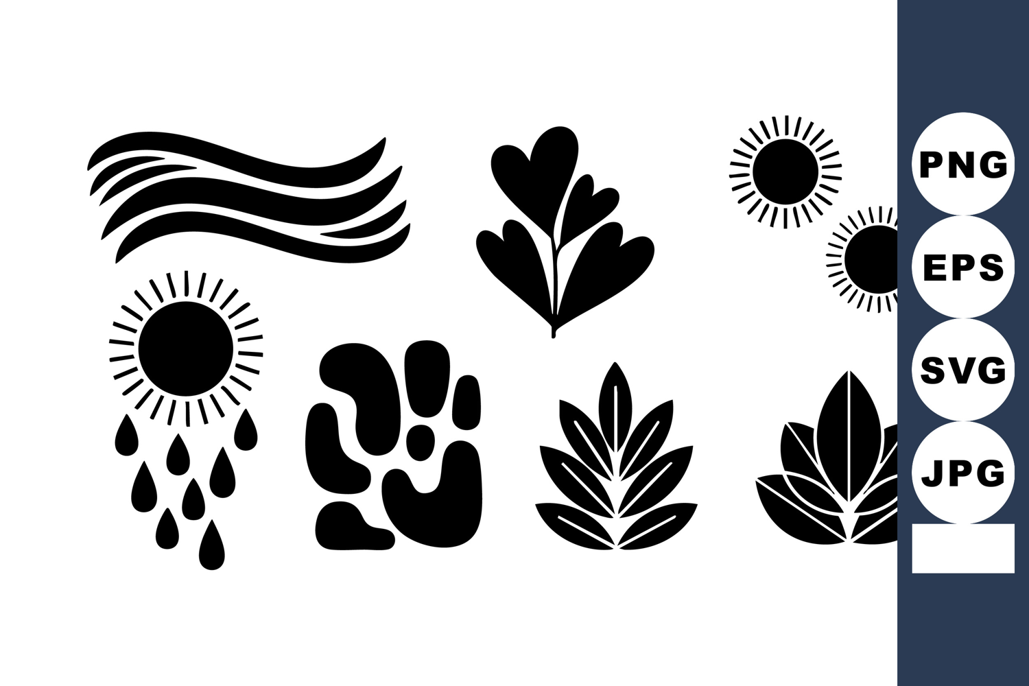 Vector file shows black silhouette icons of sun, leaves, raindrops, and abstract nature elements in minimal style, suitable for design and decoration, conveying natural theme and simplicity, calm mood.